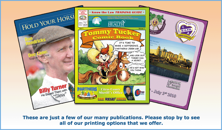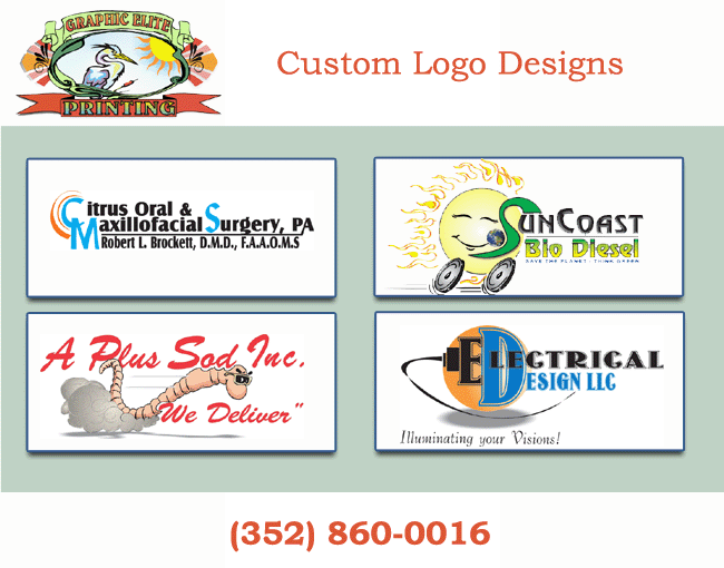 Custom Logo Designs/Branding • Brochures • Postcards • Flyers • Newsletters• Business Cards Letterheads • Envelopes • Book Printing/Binding • Custom Web Site Design • Promotional Advertising Custom Signs & Banners • Shirts |